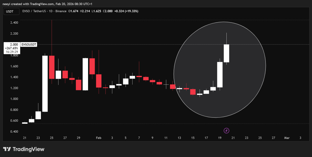 O preço do ENSO passou de uma acumulação silenciosa para uma ação explosiva em apenas alguns dias. O token subiu por 4 sessões consecutivas. O momentum acelerou nas últimas 48 horas, onde o preço do ENSO saltou mais de 80%. Um único dia registrou uma alta de 30%, o que fez os traders olharem duas vezes para o gráfico.