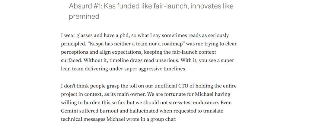 Isso cria o Absurd #1 na sua estrutura. A KAS tem um DNA de financiamento que parece de lançamento justo. Kaspa tem expectativas de entrega que parecem de um projeto com recursos profundos. Escalar uma equipe de código aberto custa muitos dólares e KAS adicionais. Essa realidade força o projeto a pensar em um desenvolvimento sustentável sem perder sua identidade descentralizada.