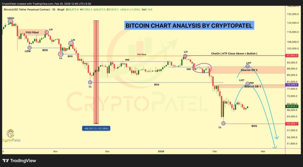 Neste momento, o Bitcoin está a negociar lateralmente nos altos dos 60.000 dólares após a sua forte queda. O gráfico diário mostra uma baixa mais baixa clara em 59.800 dólares. Esse nível é a linha que separa a recuperação de problemas reais. Tudo gira em torno dessa zona.