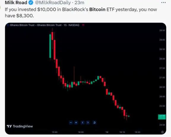 Dois dias consecutivos de baixo desempenho causaram perdas consideráveis aos investidores que correram no primeiro dia de listagem do Bitcoin. **Com base no cálculo do ETF da BlackRock, depois de investir US$ 10.000 na quinta-feira, restaram apenas US$ 8.300 na sexta-feira. **