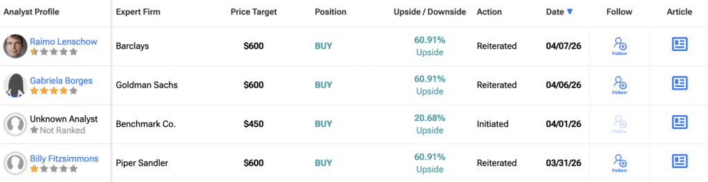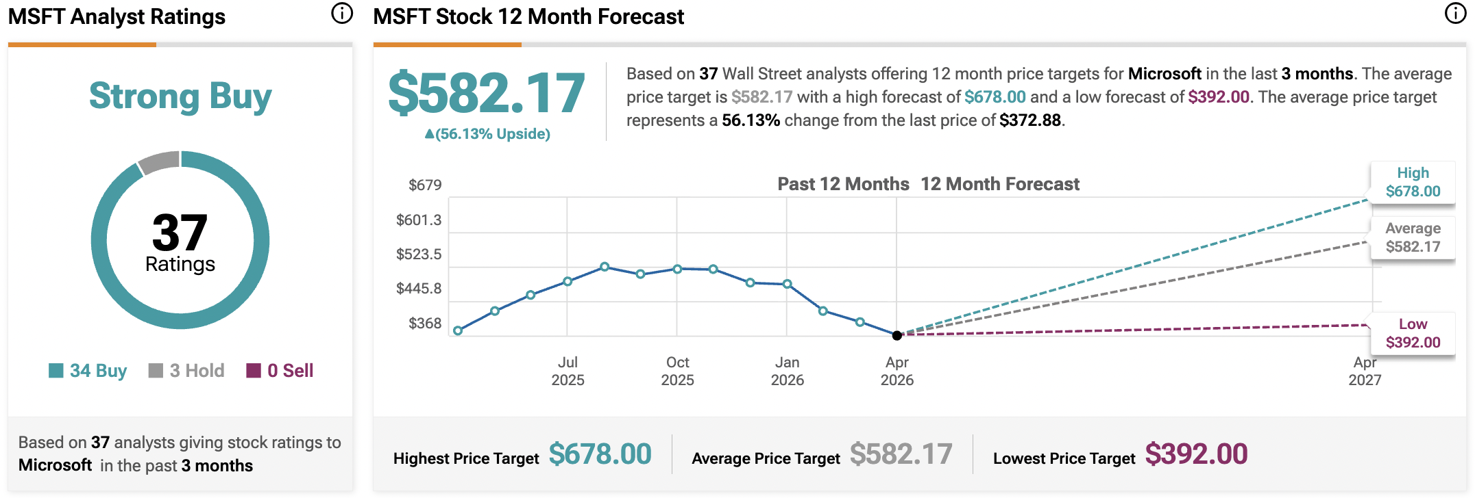 De acordo com a TipRanks, a ação da MSFT recebeu uma classificação de consenso de Strong Buy, com 34 Compras e três Manutenções atribuídas nos últimos três meses. O preço-alvo médio das ações da Microsoft é de $582.17, sugerindo um potencial upside de 56.13% face ao nível atual.
