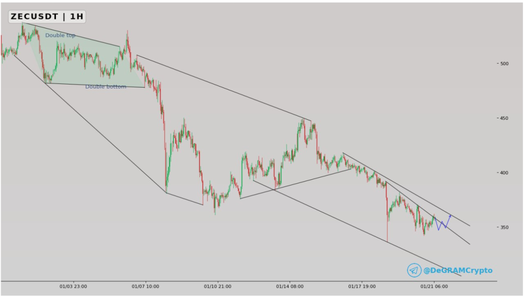 В рыночном анализе, переданном DeGram, отмечается, что движение ZEC остается плоским после длительного падения, при этом цена формирует узкий диапазон вокруг уровня поддержки в канале. По сути, графический паттерн указывает на коррекционный отскок, а не на разворот.