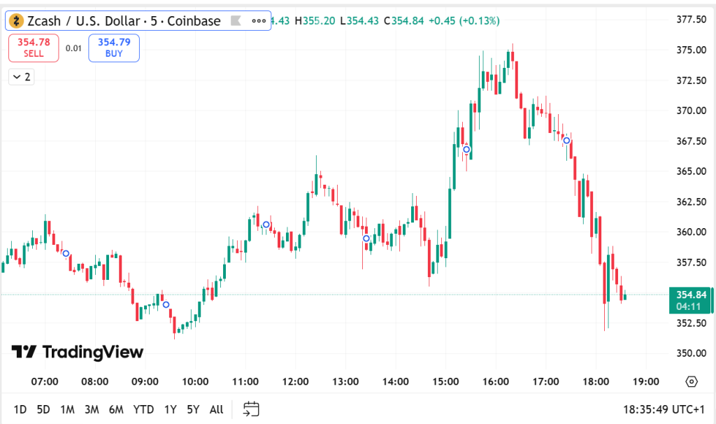 В настоящее время цена Zcash (ZEC) составляет $354.78, что показывает рост на 3.05% за текущий торговый день, при рыночной капитализации $6 миллиардов. Объем торгов снизился до $509.77 миллионов.