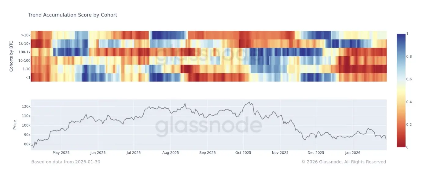 *Тенденция накопления биткойнов (Glassnode)*Данные от Glassnode показывают, что крупнейшие китовые группы находятся в стадии «легкого накопления» и поддерживают баланс от нейтрального до слегка позитивного с момента снижения биткойна до уровня 80 000 USD в конце ноября. В этот период цена в основном колебалась в диапазоне 80 000–97 000 USD до конца января.