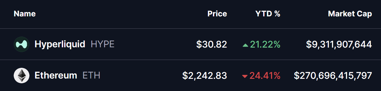 $HYPE превзошел общий рынок криптовалют, вырос при падении ETH на 24% за год