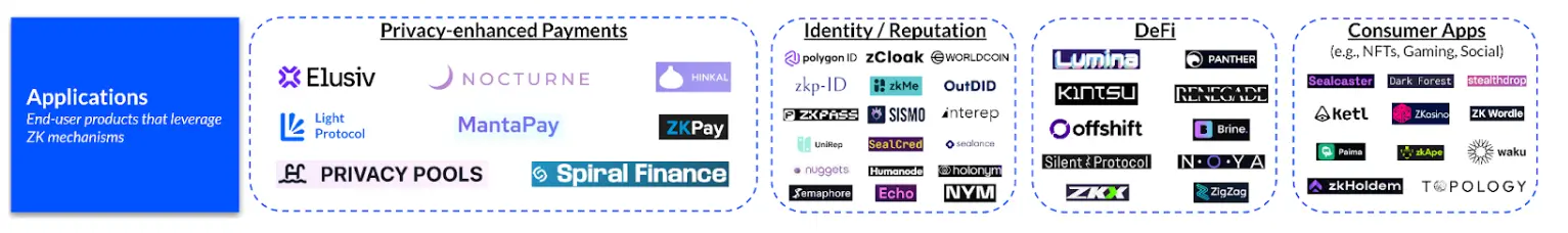 Помимо инфраструктуры ZK и сетевого уровня, появился ряд приложений для конечных пользователей, которые используют доказательства с нулевым разглашением для внутрисетевых платежей, проверки личности, частных, но соответствующих требованиям DeFi и потребительских вариантов использования.