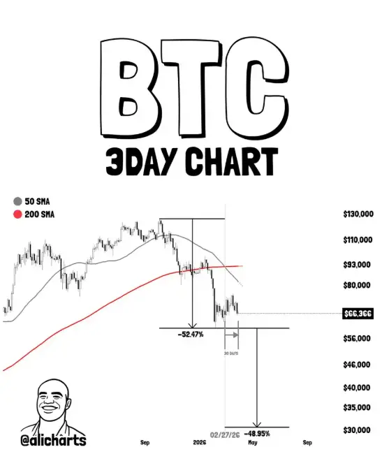 ChainCatcher-сообщение: по словам аналитика Alicharts, биткоин с пика в октябре 2025 года упал на 52%. 27 февраля появился сигнал пересечения 3-дневной SMA (бычий/медвежий «крест» между 50-периодной и 200-периодной SMA, что соответствует «медвежьему» пересечению). На данный момент сигнал продолжается 30 дней. Исторический паттерн указывает, что в течение 3–6 дней, возможно, произойдет вход в окно окончательного накопления данного цикла.