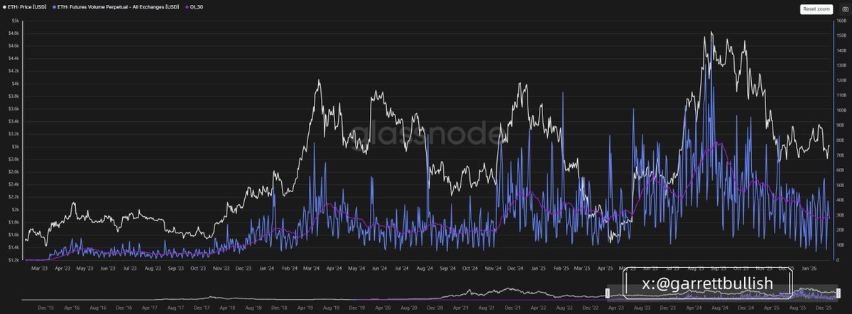 From futures trading volume, BTC and ETH activity is now close to historical lows, suggesting the deleveraging process is nearing completion.