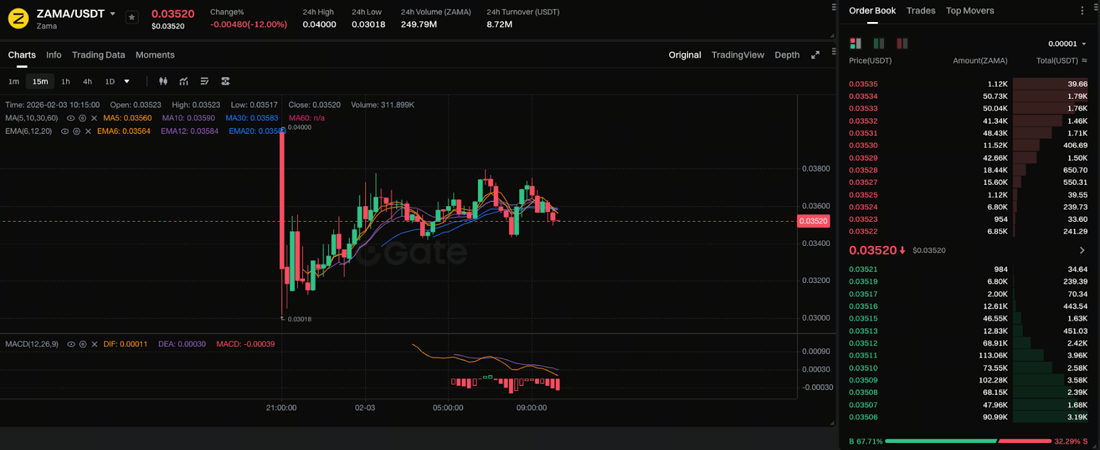 As of February 3, 2026, ZAMA is priced at approximately $0.035. The token is highly volatile; please exercise caution and manage risk when trading.