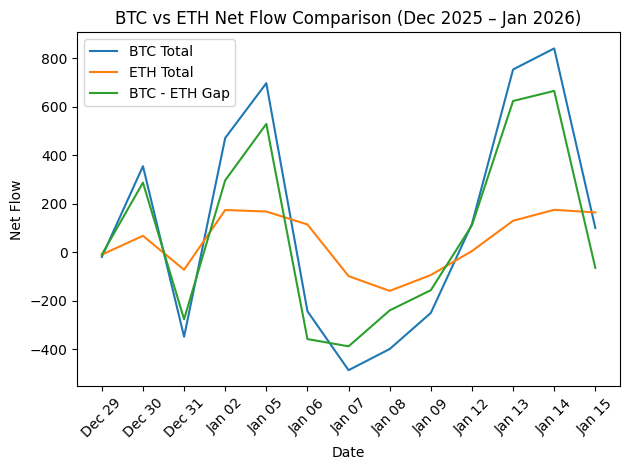 BTC vs ETH fund flow chart (Dec 2025 – Jan 2026)