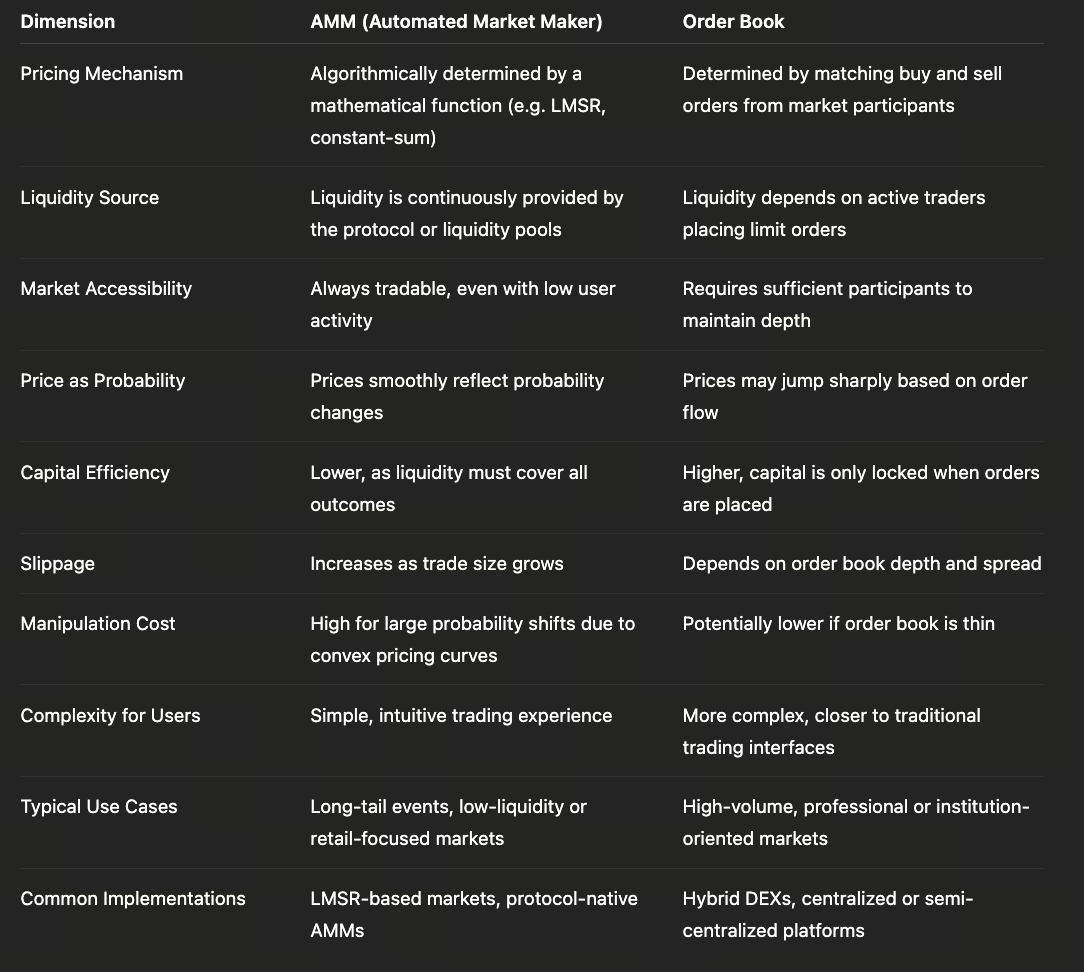 AMMs and order books aren’t simply technical alternatives—they’re economic choices for prediction markets at different stages of development and user composition. The core advantage of AMMs is “continuous tradability”—even with few participants or limited event attention, the system can algorithmically generate prices, allowing prediction markets to cover a wide range of long-tail events. This design makes AMMs key tools for early market expansion and lowering participation barriers, but comes at the cost of requiring upfront capital for all possible outcomes—leading to lower capital efficiency and amplified nonlinear price effects during large trades.