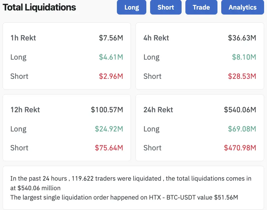 According to data from Coinglass, in the past 24 hours, more than 119,602 traders have been liquidated, resulting in total losses of up to 540 million USD. The largest liquidation occurred on the HTX exchange, with a BTC-USDT transaction worth 51.56 million USD being wiped out.
