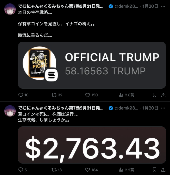 The realism of “FX Warrior Kurumi” is largely because the original author, de-munya, is an active investor himself, often sharing his loss experiences on social media. During the 2020-2021 crypto bull market, he revealed that he invested in a Christmas meme coin, which ultimately resulted in a loss.