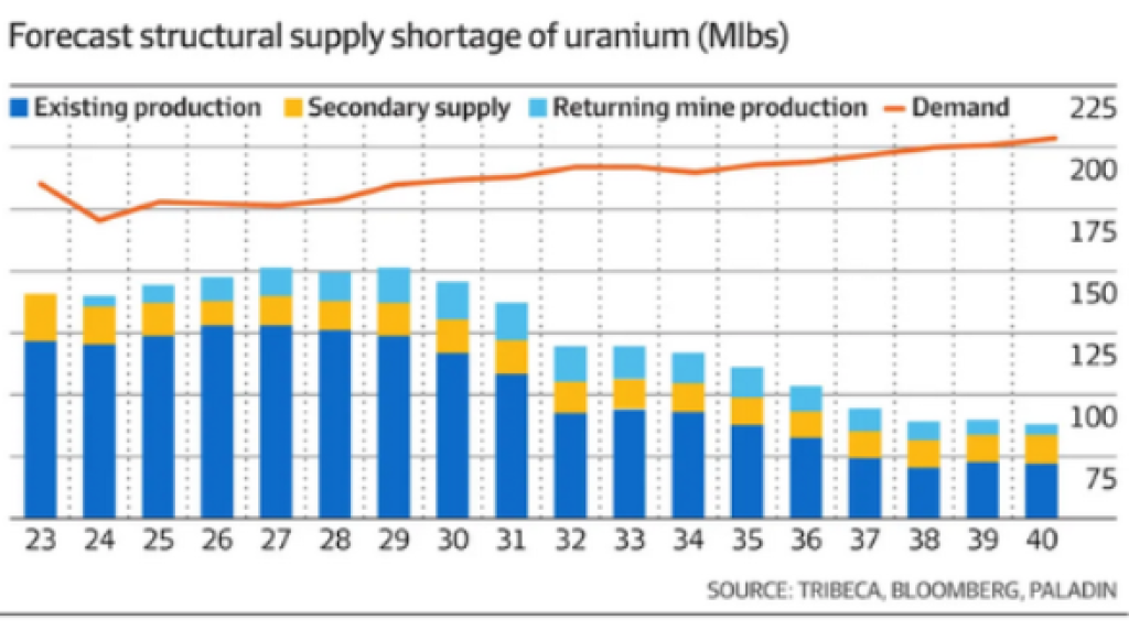 The chart shows uranium demand moving toward ~225 million pounds annually while projected supply struggles to stay near ~110–120 million pounds. That is a systemic one.
