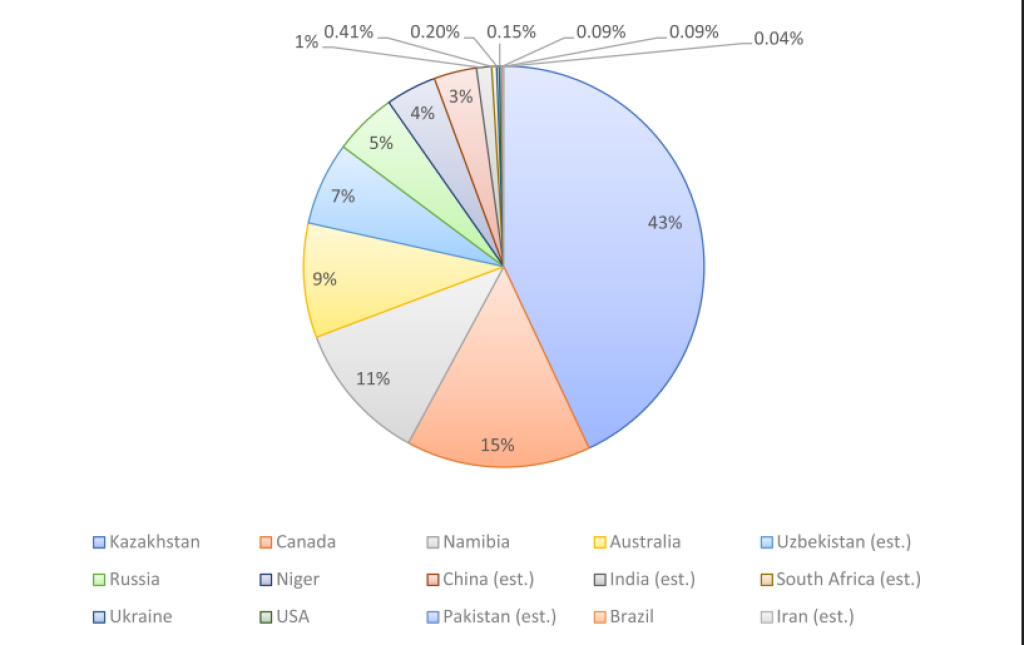 Kazakhstan alone accounts for roughly 43% of total output, while Canada contributes about 15%. That level of concentration would already be uncomfortable for any critical resource. But the real problem is what happens next.