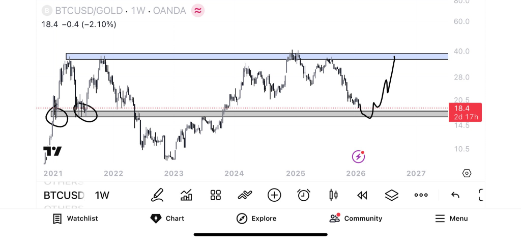 Chetan highlights this structure clearly, noting that BTC against gold is approaching the 17.6 to 16.3 range, an area that has repeatedly acted as a base for reversals over the past several years. That context matters because relative charts often turn before absolute price charts do, especially when broader macro conditions start to shift.