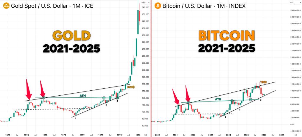 The comparison does not suggest identical outcomes, but it highlights how prolonged consolidation near previous peaks can act as a base rather than a ceiling. Gold spent years frustrating participants before entering its strongest phase, and Bitcoin appears to be moving through a comparable compression period between 2021 and 2025.