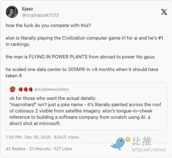 “Macrohard is not just a joke—this term is actually painted on the roof of the Colossus 2 data center, clearly visible from satellite images. It’s Musk’s classic trolling: using this name to mock the software giants building AI from scratch, referring to Microsoft.”