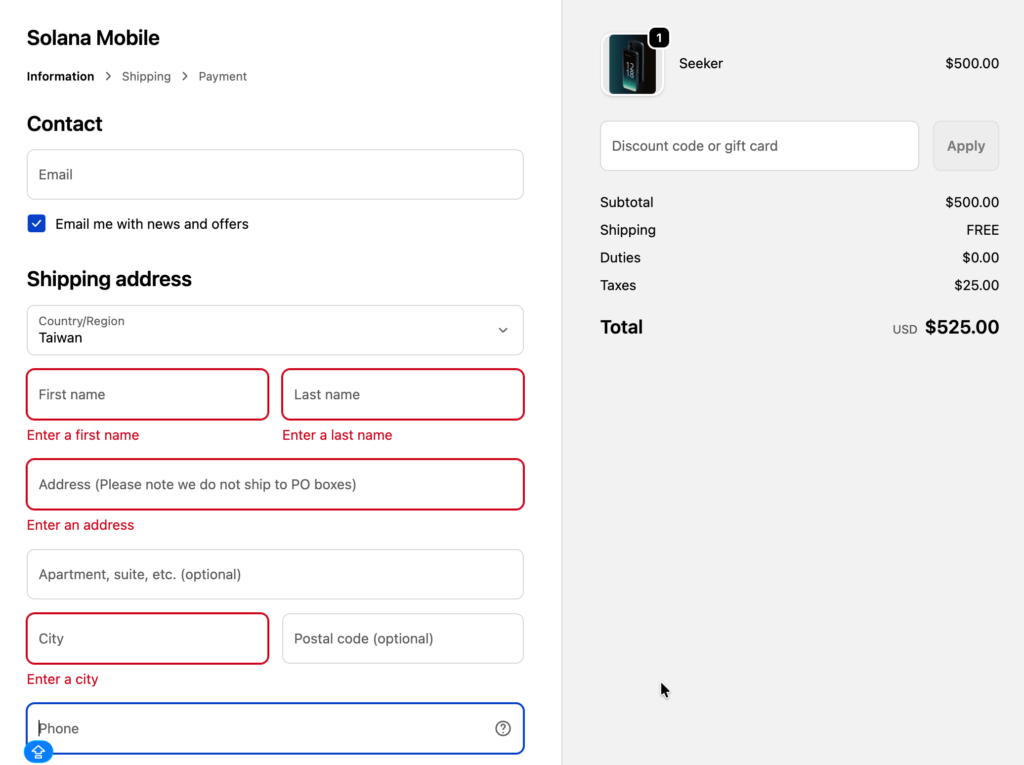 According to DappRadar’s testing, during the event period, simply click “order” on the homepage, then sequentially enter the address (in English), phone number, confirm shipping fee (free in Taiwan), and finally select “Solana Pay” as the payment method. When choosing the payment token, select “SKR,” and you will see the message that the payment price is halved.