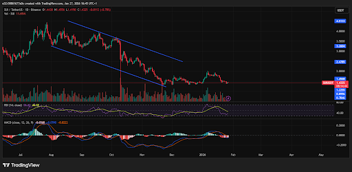 It currently trades around $1.44 with a market cap of around $5.46 billion, and technical analysis shows the asset is trading below several major moving averages. This indicates that Sui is in the middle of a consolidation or downward bias in the short term.