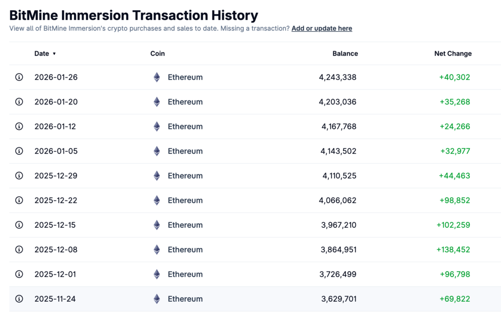 Global Ethereum reserve giant Bitmine (BMNR) launched its ETH accumulation plan last July. According to the latest announcement, the company has accumulated 4,243,338 ETH, accounting for 3.52% of Ethereum’s total circulating supply.