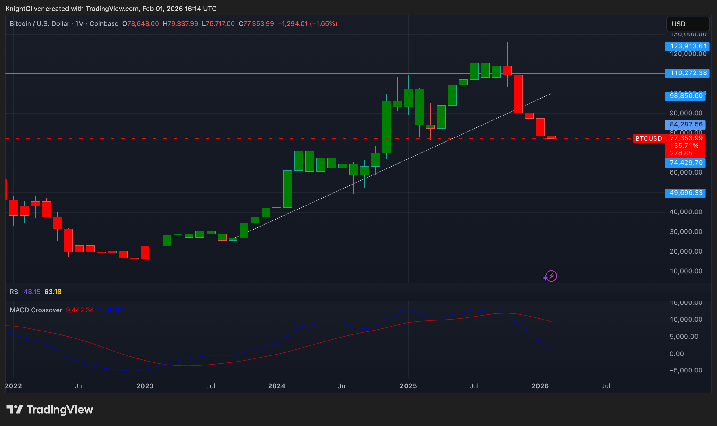Bitcoin experienced a sharp decline over the weekend, dropping below $78,000 and triggering a wave of liquidations; former NYSE Arca options trader Eric Crown warns that technical indicators are turning fully bearish, and BTC may further decline to the $50,000–$60,000 range.