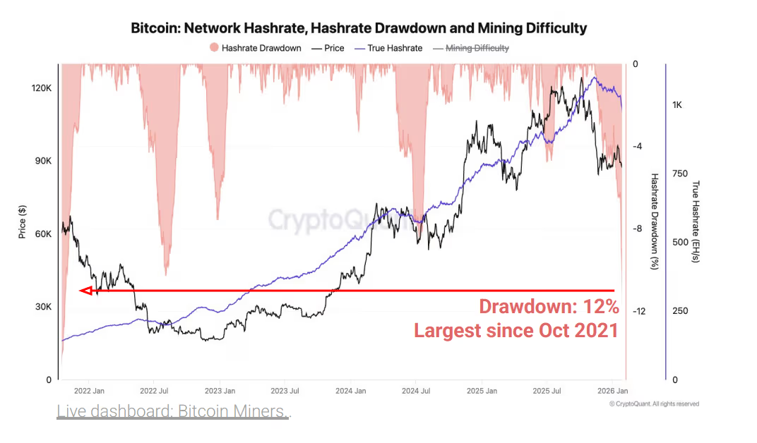 According to on-chain data from CryptoQuant, the total network hash rate has sharply decreased by about 12% since November 11 of last year. This is the largest single-day drop since China’s全面 ban on mining in October 2021. Currently, the total network hash rate stands at only 970 EH/s per second, the lowest level since September 2025.