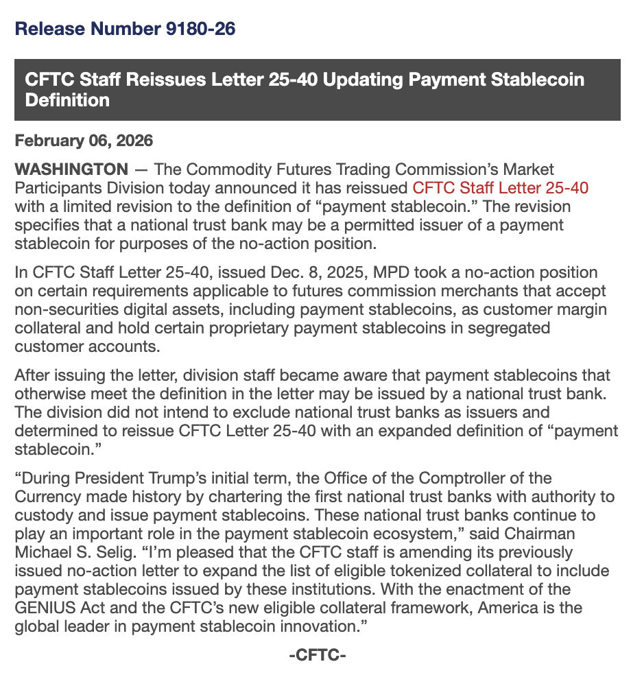 The U.S. Commodity Futures Trading Commission (CFTC) issued an important update to its guidelines on February 6, 2026, officially revising the previous staff letter to fully align with the regulatory framework established by the GENIUS Act. The core of this revision is to expand the standards for payment stablecoin issuers, explicitly including National Trust Banks in the list of qualified financial institutions, granting them the legal status to issue fiat-pegged tokens.