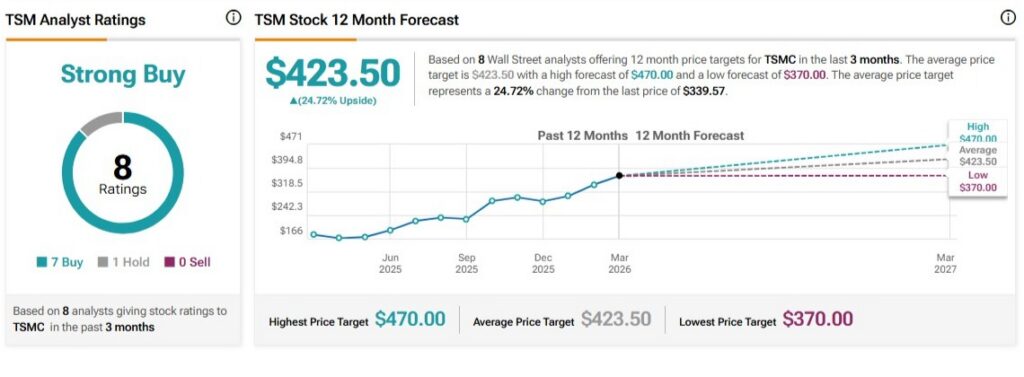 On Wall Street, TSM stock has a Strong Buy consensus rating, based on seven Buy and one Hold ratings. Notably, no analyst rates the stock a Sell. Also, TSM’s average stock price target of $423.50 implies over 24% upside potential over the next 12 months.