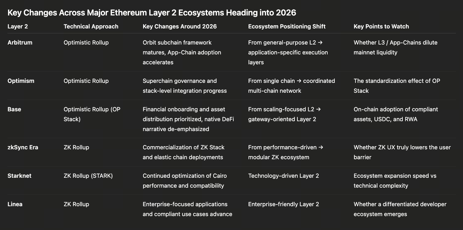У 2026 році основні публічні ланцюги та Layer2-екосистеми демонструють чітко визначені цілі, розширені сценарії використання і посилені базові можливості. Оновлення платформи Ethereum через Pectra/Fusaka значно покращують масштабування й продуктивність, а також просувають приватність і зручність вузлів; Layer2, такі як Arbitrum і Optimism, досягають вищої ефективності виконання й безпеки. Solana і BNB забезпечують високу пропускну здатність, впроваджуючи протоколи приватності та вдосконалені комплаєнс-механізми. Нові ринкові тренди включають мультичен-розповсюдження stablecoin і локальні інновації (USDC, PYUSD, USDsui тощо), токенізацію RWA (Treasuries, приватні фонди тощо) та побудову ончейн-комплаєнс-шляхів — це ключові ознаки змін у провідних екосистемах ланцюгів.