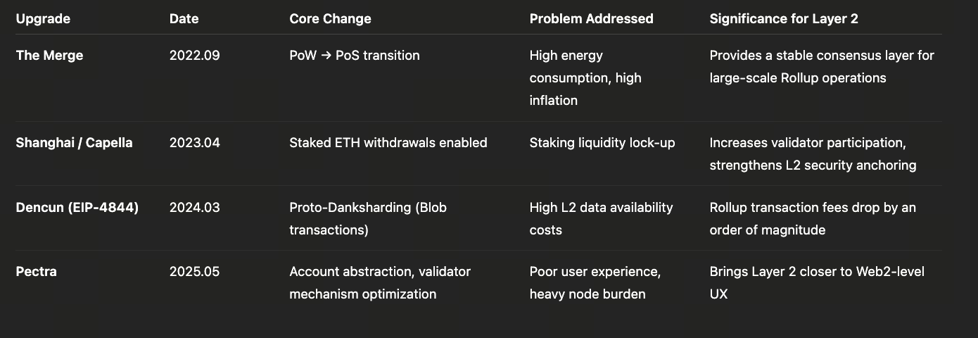 У 2023–2025 роках Ethereum завершив ключові оновлення: The Merge, Shapella, Dencun, переходячи до PoS і шардінгу. Оновлення Pectra у квітні 2025 року стало найбільшим — впроваджено абстракцію акаунтів (EIP-7702), оптимізацію виконання EVM і вдосконалення консенсусу. Основна мета — «покращити досвід стейкінгу, збільшити масштабованість Layer 2 і розширити пропускну здатність мережі». Наприклад, пропозиція EIP-7251 підвищує ліміт стейкінгу з 32 ETH до 2 048 ETH; EIP-7002 дозволяє більш гнучкі виведення стейкінгу, залучаючи великі інституції та сприяючи децентралізації. Оновлення також передбачає оптимізацію для Layer 2, зокрема PeerDAS (подібний до EIP-4844) у Pectra для розширення Blob-стореджу та підтримки більшої пропускної здатності даних.