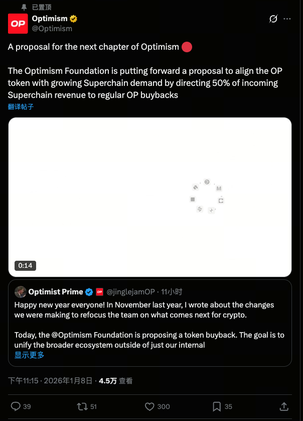 У січні 2026 року фонд Optimism офіційно подав до спільноти управління пропозицію, що має статус етапної: виділити 50% доходу мережі Superchain на регулярний викуп токенів OP.