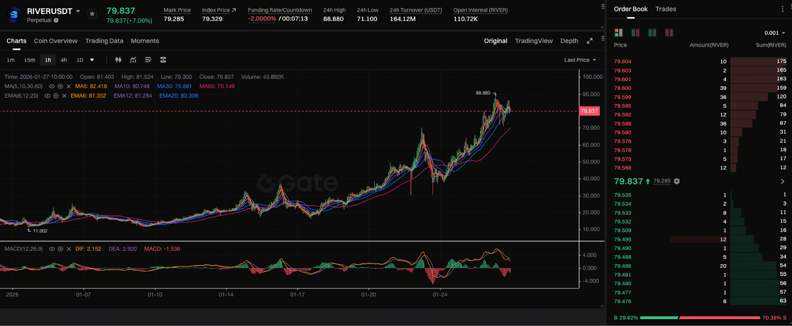 У короткостроковому періоді RIVER торгується на підвищених рівнях у діапазоні $75–$87. Добовий обсяг торгів різко зріс, що свідчить про зростання ринкової активності та ліквідності.