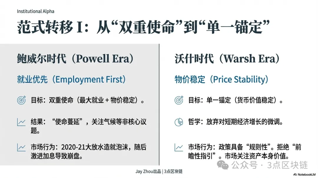 Щоб зрозуміти вплив Варша на крипторинок, важливо чітко розмежувати його підхід від монетарної політики Пауелла. ФРС Пауелла характеризувалася дискреційними рішеннями, тісно пов’язаними з циклами зростання і падіння криптоактивів. Рамка Варша акцентує політику, засновану на правилах, і незалежність центробанку — це змінить логіку ціноутворення криптоактивів.