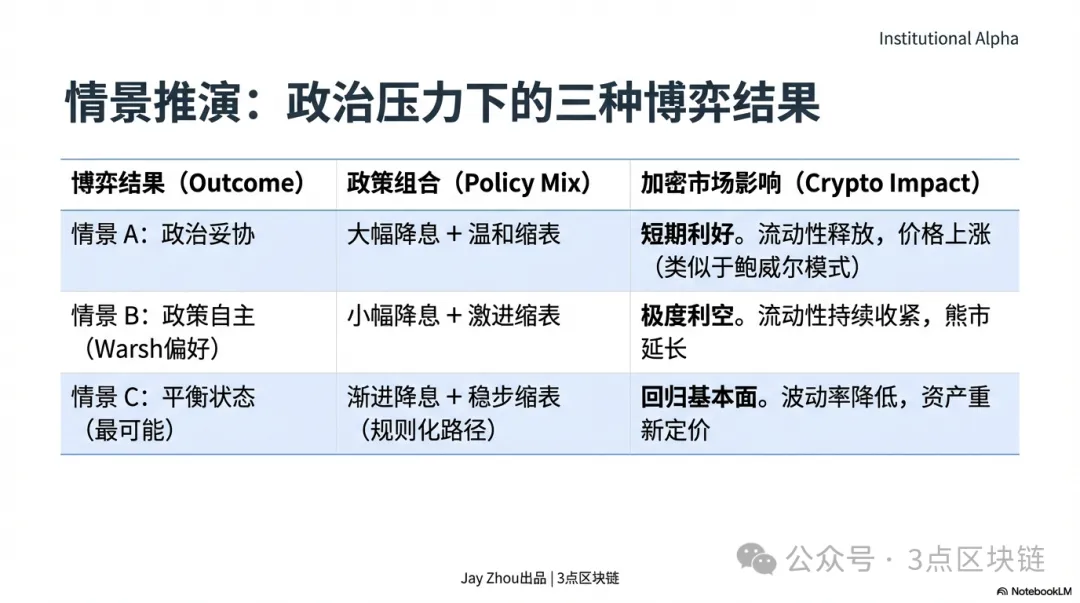 Ще одна важлива відмінність — реакція на політичний тиск. Пауелл чинив опір вимогам Трампа щодо зниження ставок, дотримуючись підвищення для боротьби з інфляцією та збереження незалежності. До 2025 року, коли борг США перевищив 38 трлн доларів, а чисті процентні витрати наблизилися до оборонного бюджету, Пауелл змушений був піти на компроміс — призупинити скорочення балансу та помірно знизити ставки для полегшення обслуговування боргу. Варш зіткнеться з ще більшим тиском. Трамп чітко заявив, що прагне агресивного зниження ставок для стимулювання зростання та зменшення витрат на борг. Варш неодноразово підкреслював незалежність ФРС і заявляв, що не піддасться політичному тиску. Deutsche Bank зазначає, що ринки уважно стежитимуть, чи зможе Варш зберегти незалежність — це ключовий чинник довіри. Для крипто, якщо Варш поступиться і запустить «агресивне зниження ставок плюс м’яке скорочення балансу», короткострокова ліквідність зросте, що підтримає ціни; якщо ж він дотримуватиметься «помірного зниження ставок плюс агресивного скорочення балансу», ліквідність буде обмеженою, і ведмежий ринок може затягнутися.