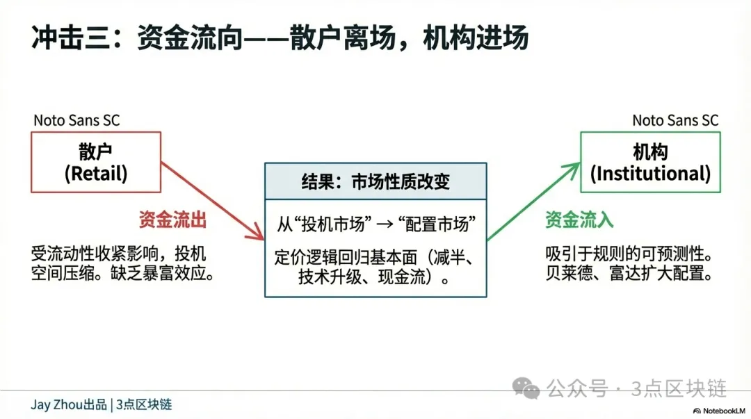 Політика ФРС епохи Варша призведе до розколу потоків капіталу у крипто — прискорення інституційного входу та тривалого виходу роздрібних інвесторів. Підхід Варша, заснований на правилах, підвищить передбачуваність і залучить більше традиційних фінансів у крипто. Керуючі активами, як BlackRock і Fidelity, можуть збільшити частку Bitcoin ETF у портфелях і додати крипто до довгострокових стратегій; інвестиційні банки, як JPMorgan і Goldman Sachs, можуть запускати більше криптодеривативів для хеджування інституційних ризиків.
