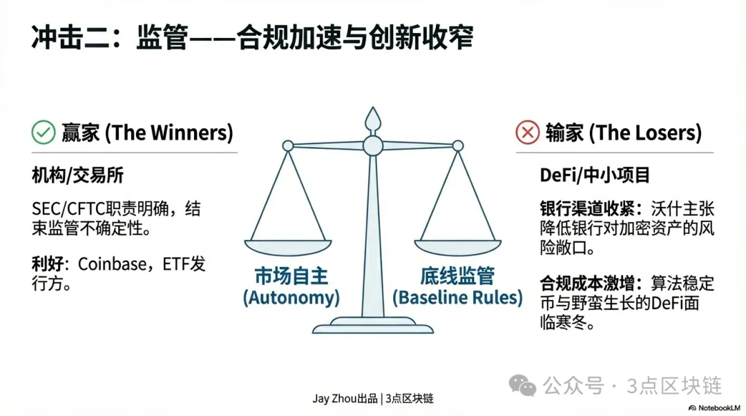 У довгостроковій перспективі підхід Варша спричинить переформатування галузі та диференціацію. Прискорена комплаєнс змусить провідні біржі та емітентів стейблкоїнів посилити контроль ризиків. Наприклад, Coinbase і Binance можуть бути змушені підвищити прозорість і розкривати більше даних про користувачів і транзакції; USDT і USDC можуть зіткнутися з жорсткішими аудитами резервів. Зростання витрат на комплаєнс тиснутиме на невеликі проєкти, які можуть не отримати банківських кредитів і змушені будуть покладатися на венчурний капітал чи ICO. Варш обережний щодо алгоритмічних стейблкоїнів і DeFi, ймовірно, обмежить інновації у цих сферах. Для інвесторів посилиться «ефект лідерства»: мейнстрім-активи, як Bitcoin і Ethereum, із високим рівнем комплаєнсу та ліквідності, залучатимуть інституції, а альткоїни без реальних кейсів і з високими ризиками комплаєнсу можуть бути витіснені.
