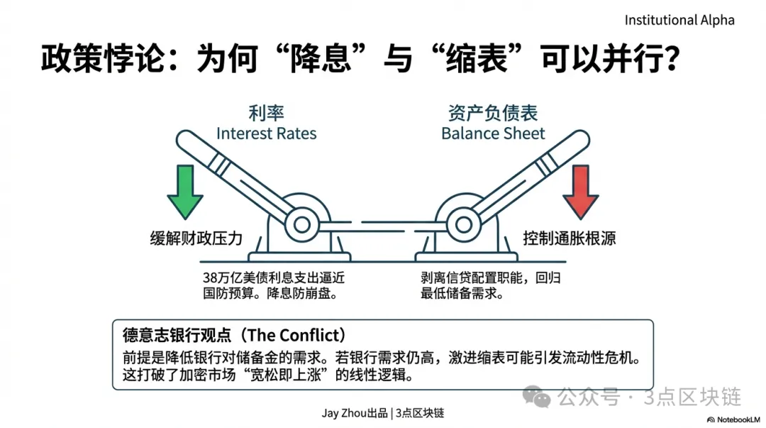 Аналітики Deutsche Bank під керівництвом Метью Луззетті описують політичну рамку Варша як «зниження ставок і скорочення балансу одночасно». Це, на перший погляд, суперечливе поєднання спрямоване на вирішення основної дилеми ФРС — зниження тиску високих ставок на держборг і уникнення надмірної ліквідності, яка може знову розігнати інфляцію.