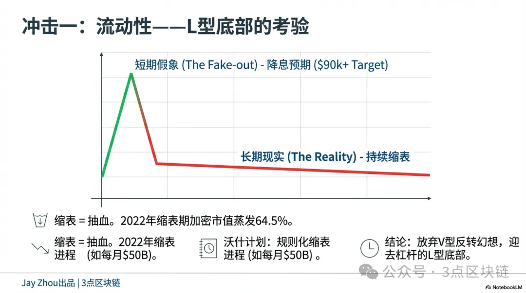 У довгостроковій перспективі скорочення балансу постійно зменшуватиме ліквідність і стримуватиме оцінки активів. Скорочення балансу ФРС фактично вилучає ліквідність, що була ін’єктована під час кризи, зменшує глобальну пропозицію долара і знижує оцінки ризикових активів. У 2022 році капіталізація крипторинку скоротилася на 64,5 % під час скорочення балансу ФРС, що свідчить: ведмежий ефект перевищує вплив підвищення ставок. Підхід Варша базується на правилах і є тривалим, а не одноразовим. Deutsche Bank очікує, що Варш може встановити фіксований шлях скорочення — мінус 50 млрд доларів щомісяця, поки баланс не знизиться до близько 20 % ВВП. Така передбачуваність дозволяє ринкам заздалегідь закладати у ціни затягування ліквідності; падіння можуть бути менш різкими, але більш тривалими. Для інвесторів «ловити дно» стане набагато складніше. За Пауелла можна було чекати завершення циклу підвищення ставок чи початку зниження, щоб вгадати дно; за Варша тривалий і передбачуваний процес скорочення означає «L-подібне» дно, що вимагає переходу від спекулятивного пошуку відскоків до довгострокового фокусу на вартості.