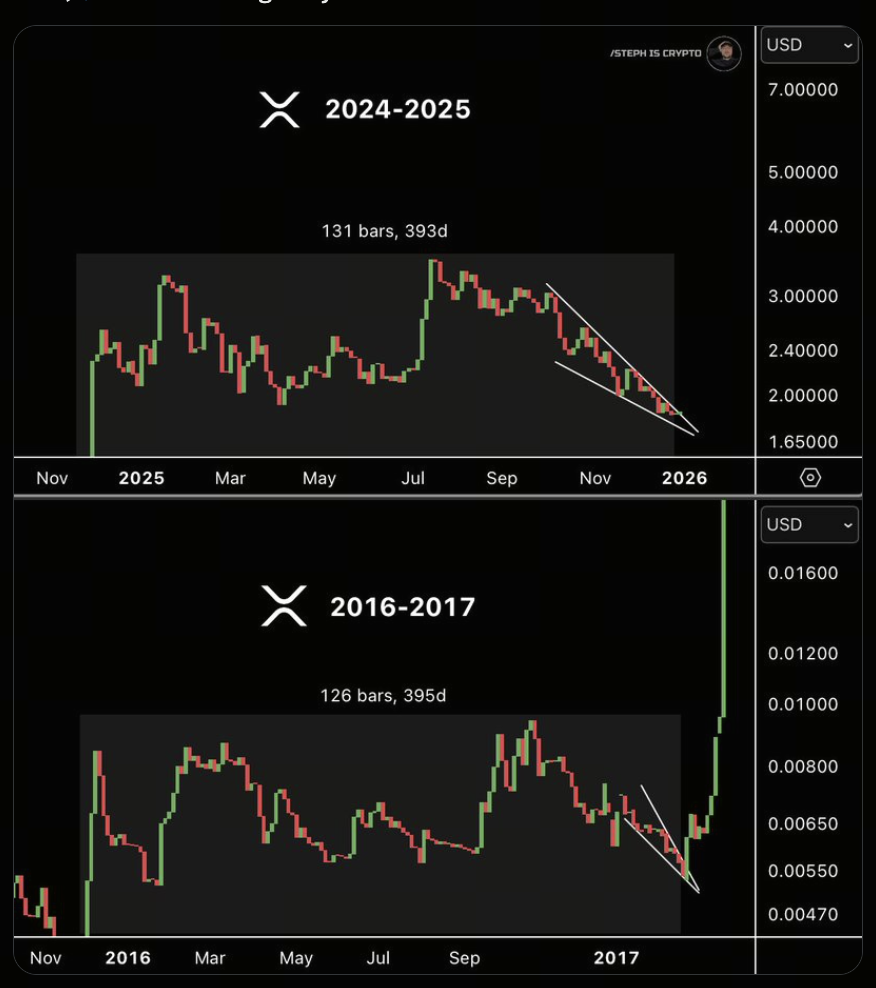 Аналіз графіка показує, що XRP проходив близько 393 днів консолідації у діапазоні, що майже відповідає 395-денному періоду консолідації перед бичачим трендом 2016–2017 років. Тоді ціна XRP багаторазово коливалася у вузькому діапазоні, а покупці та продавці тривалий час перебували у протистоянні без чіткого напрямку руху.