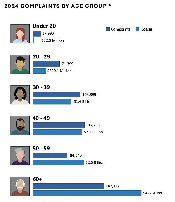 У випадках шахрайства з інвестиціями в криптовалюти найбільше скарг надходить від людей старше 60 років (8 043 випадки), а загальні збитки становлять 1,6 мільярда доларів, що значно перевищує інші вікові групи. Люди старше 60 років, через недостатню обізнаність про запобігання шахрайству та незнайомство з новими способами оплати, такими як криптовалютні банкомати, стали основною метою шахраїв (2 674 випадки, збитки 107 206 251 доларів), а також є найбільшою групою, щодо якої надходять скарги на шантаж/сексуальний шантаж (20 445 випадків, збитки 724 288 735 доларів).