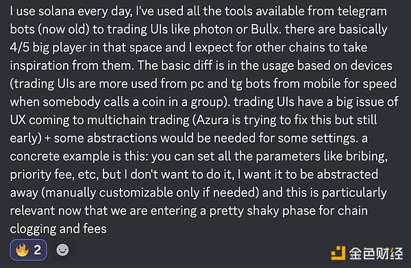 Більшість платформ виглядають так, ніби вони створені для людей, які вже знайомі з торгівлею в мережі, мостовими зв’язками та DeFi – все це означає складність. Але поспілкувавшись з кількома різними трейдерами, я виявив, що трейдери, схоже, хочуть отримати складні функції без складного інтерфейсу. Існуючий «просунутий» інтерфейс все ще не забезпечує параметризацію, яка потрібна просунутим трейдерам, а інтерфейс за замовчуванням занадто спрощений і абстрагується від функцій, які можуть мати величезний вплив на прибуток. Наприклад, як сказав один трейдер, навіть функція, яка «автоматично повідомляє мені, скільки грошей я збираюся витратити на цю транзакцію (газ + комісія за транзакцію), щоб переконатися, що транзакція пройде гладко», може змусити досвідчених користувачів сказати: «Ну, це здається високим, я, ймовірно, не хочу платити це», а також дає звичайному користувачеві деякий опис того, скільки вони збираються заплатити.