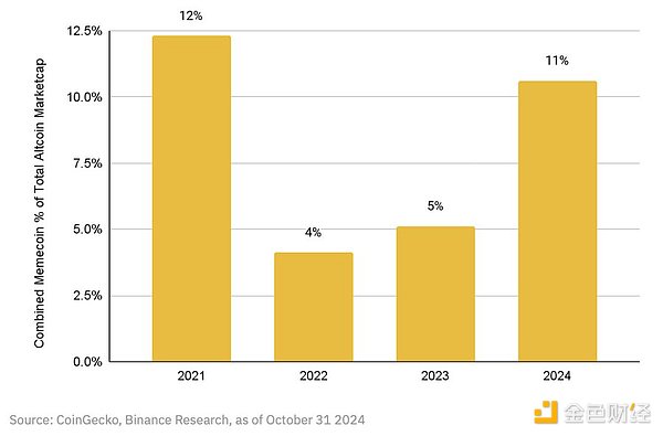 Останнім часом зростання мем-криптовалюти далеко не є короткочасним явищем. Дослідження Binance вказує на те, що з 2022 року частка капіталізації мем-криптовалют у порівнянні з капіталізацією не-BTC/ETH/стейблкойнів за короткий проміжок часу зросла з 4% до 11%, майже подвоївши свою частку на настільки конкурентному ринку.