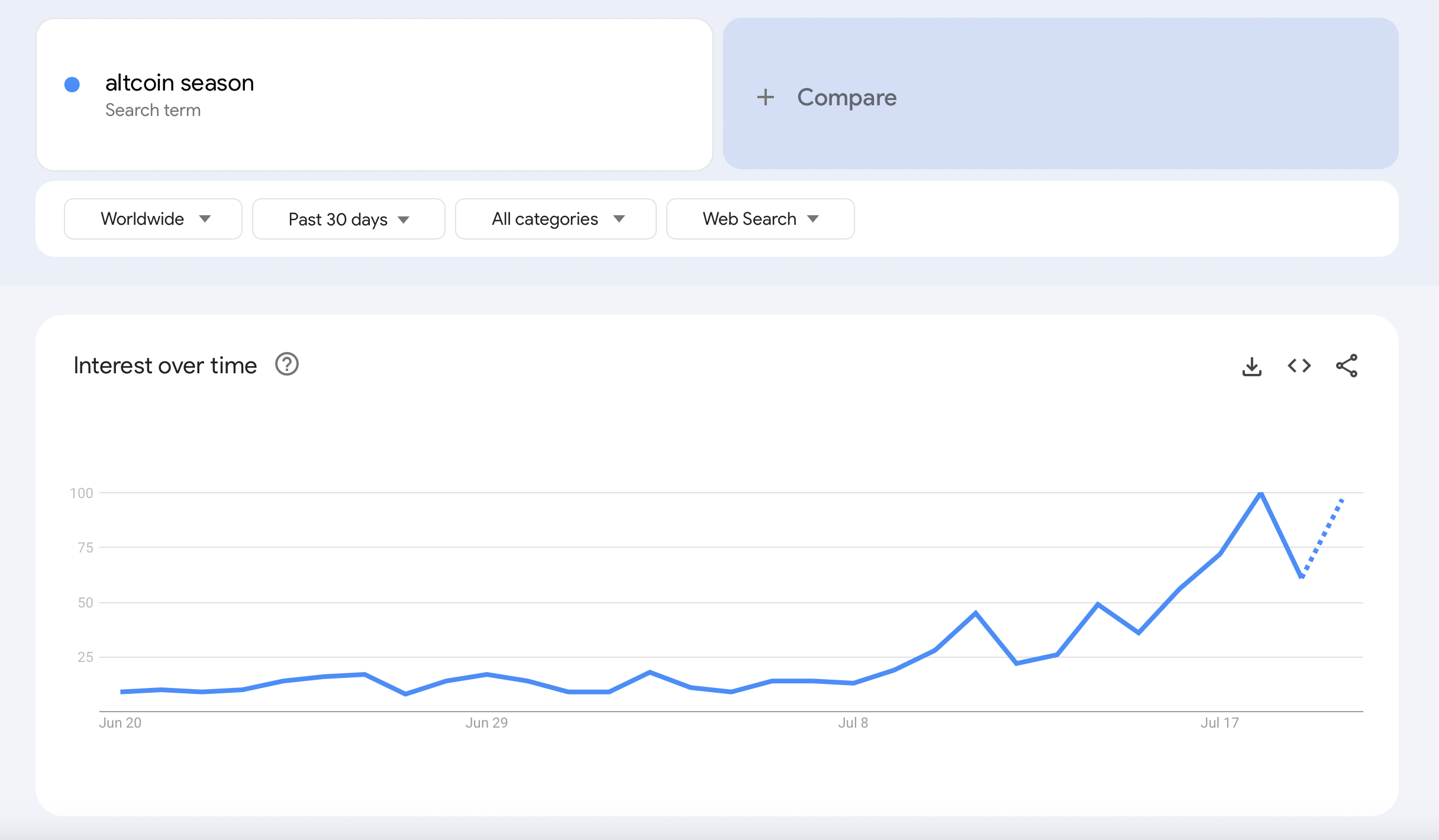 Ключове слово «альти сезону» (altcoin season) в Google Trends досягнуло максимального значення 100 18 липня. Станом на 20 липня дані все ще оновлюються, обсяги пошуку досягли 97, що є значним зростанням в порівнянні з суботніми 61. Обсяги пошуку ключового слова «альти» (altcoins) також показують, що інтерес людей не зменшується — в п’ятницю досягли 75, в суботу трохи знизилися до 47, сьогодні знову сильно піднялися до 78.