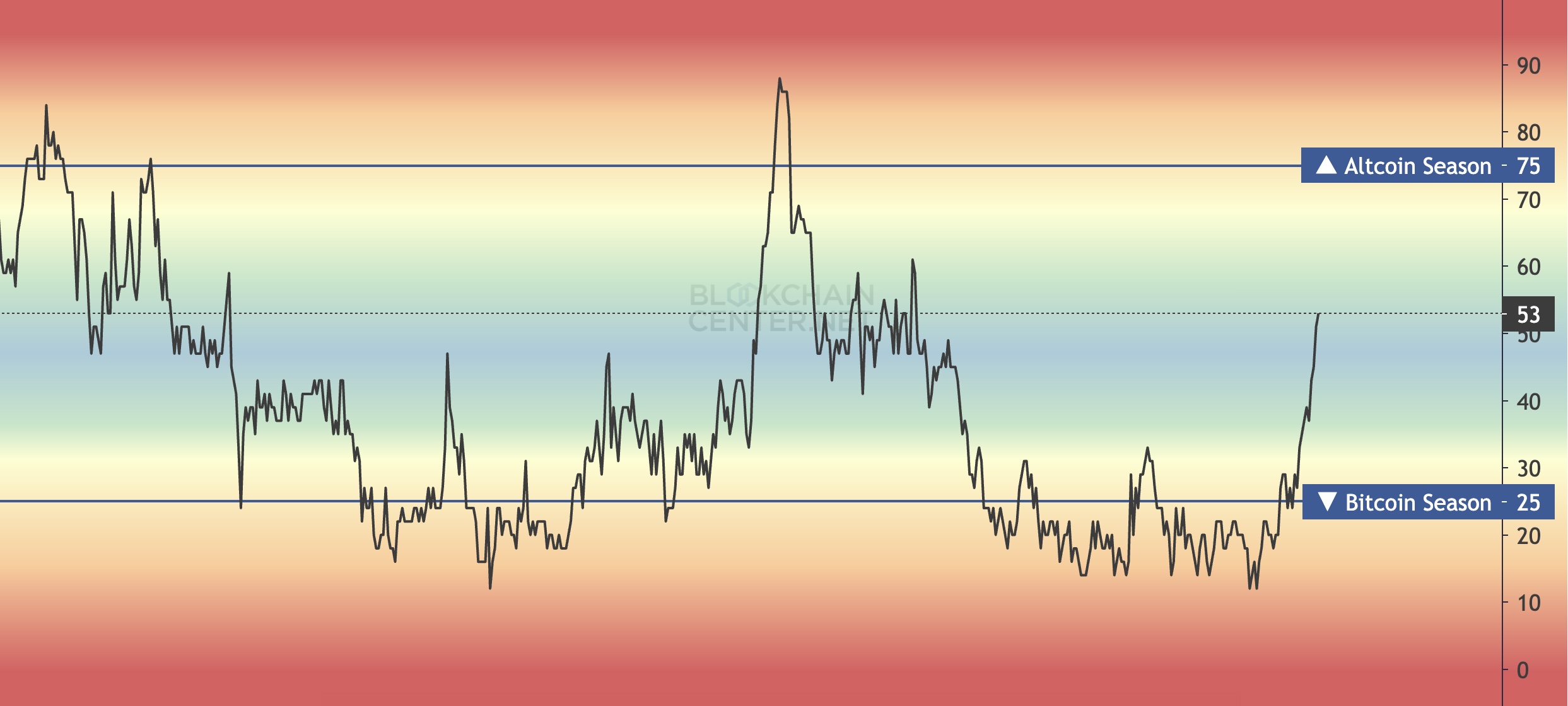 Індекс сезону альтів (ASI) минулого тижня залишався на рівні близько 39%, але тепер він підскочив до 53%. Хоча до офіційного знака сезону альтів у 75% ще є невелика відстань, поточна віддача свідчить про те, що ринок ближчий до цього моменту вибуху, ніж будь-коли раніше.