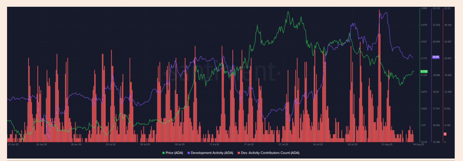 Незважаючи на те, що в кінці липня ціна ADA тимчасово впала нижче 0,62 долара, активність розробки у блокчейні Cardano (Development Activity) показала суттєвий ріст. Частота提交 коду та кількість основних учасників продовжували зростати до кінця липня, що свідчить про впевнений信念 розробників у довгостроковій цінності екосистеми. На початку серпня, після офіційного затвердження фінансування на 70 мільйонів доларів та подальшого зростання показників розробницької активності, ціна ADA синхронно відскочила до рівня 0,735 долара. Така тенденція “розробка попереду, ціна слідує” зазвичай розглядається як позитивний сигнал зростання базової вартості.