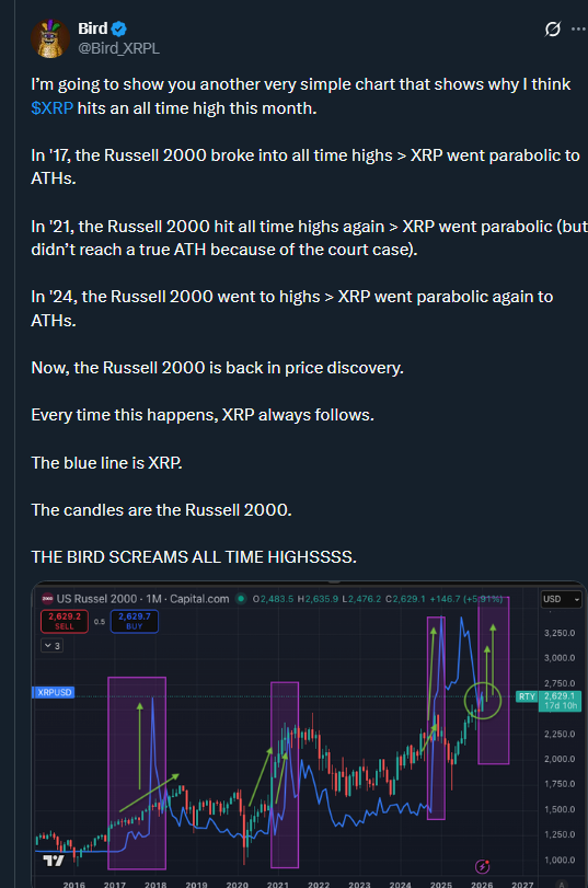 Згідно з даними криптодевелопера Bird (на X), XRP досягає своїх історичних максимумів кожного разу, коли Russell 2000 проривається вгору. Це почалося у 2017 році, коли сплеск малих капіталізацій підняв XRP до $3,84, його історичного максимуму.