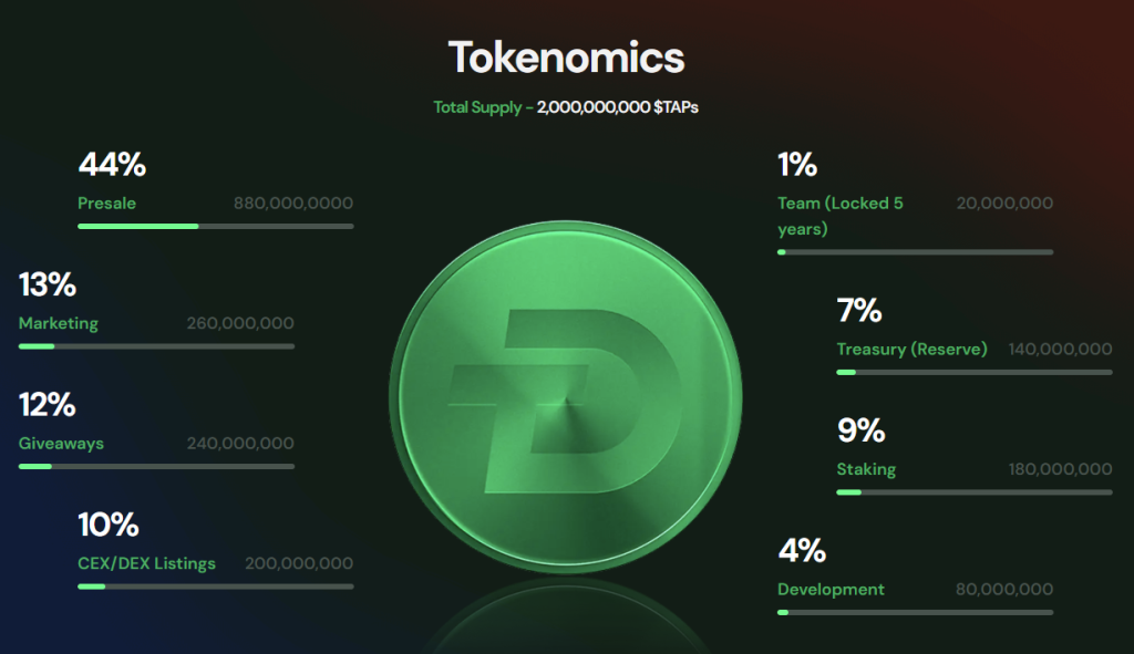 Токеноміка добре продумана. Загальний обсяг обмежений 2 мільярдами токенів $TAP. Розподіл структурований так: 44% — для пресейлу, 9% — для стейкінгу, 12% — для розіграшів, 13% — для маркетингу, 10% — для лістингів на CEX/DEX, 7% — для резервів казначейства, 4% — для розробки і лише 1% — для команди, заблоковані на п’ять років.
