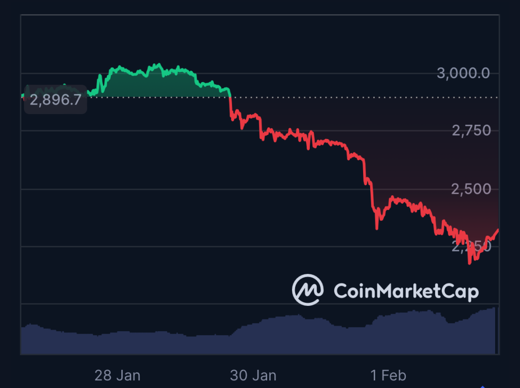 У ринку альткоїнів Ethereum зазнав одного з найсильніших ударів. Після початку тижня 27 січня приблизно за 2 889 доларів, ETH не зміг утримати ключові рівні підтримки і різко пішов вниз, опустившись до близько 2 294 доларів станом на 2 лютого.