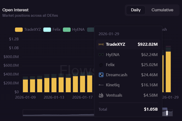 За минлий тиждень, щоденний обсяг торгів на ринках HIP-3 зріс до приблизно $4.83 мільярдів, встановивши новий рекорд. Одночасно, відкритий інтерес (OI) піднявся до рекордних $1.05 мільярдів, що в основному зумовлено зростанням попиту на ончейн-експозицію до товарів.